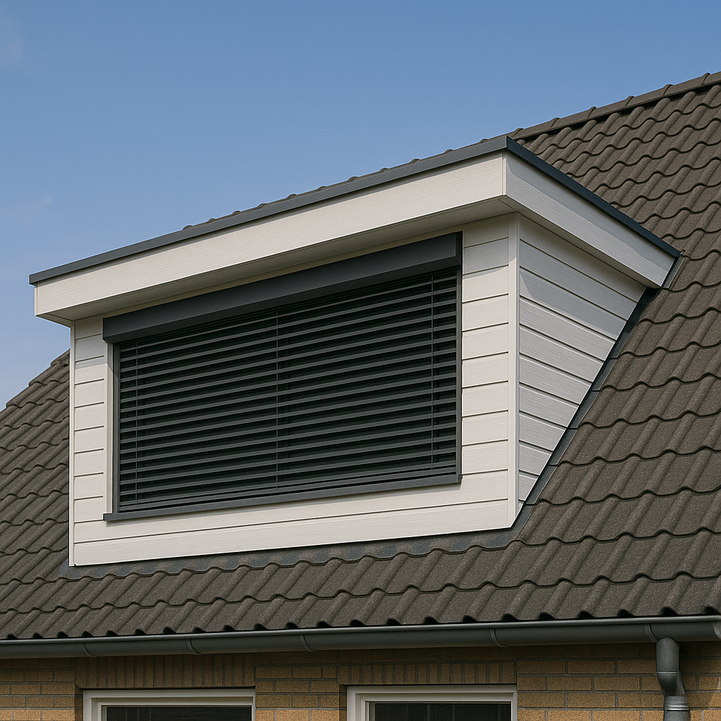 Dakkapel met zwarte horren op een dak met rode dakpannen, vastgemaakt aan een woning met gele bakstenen.